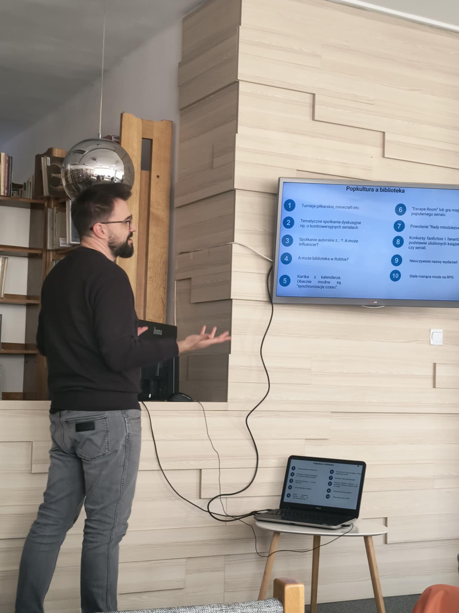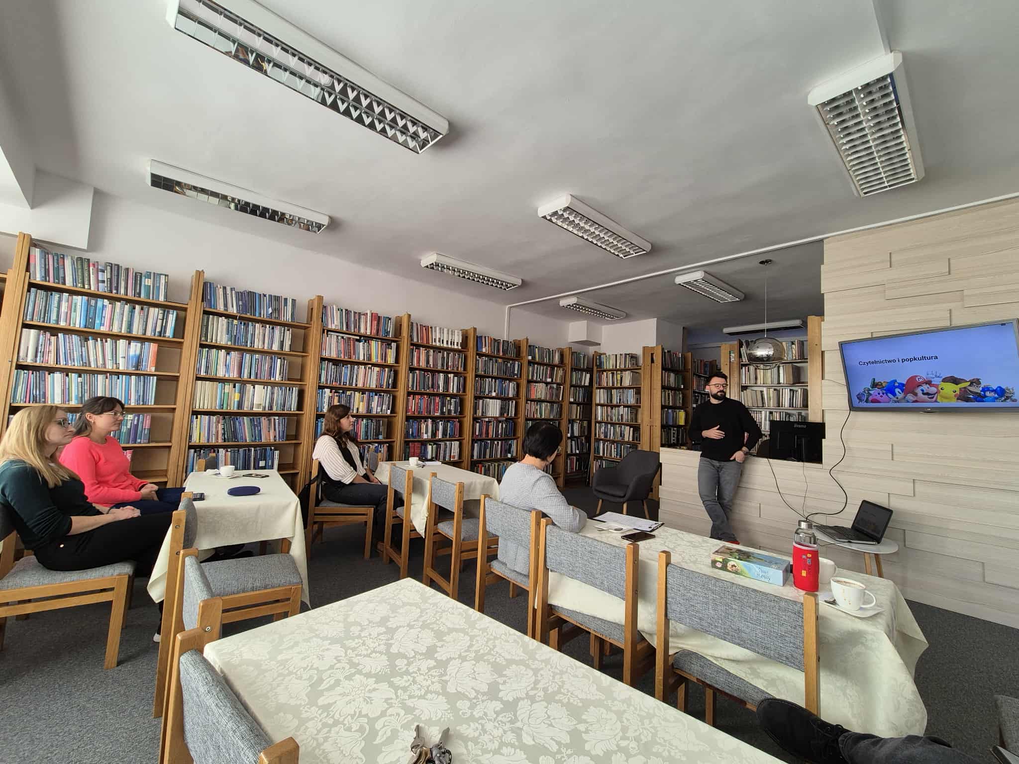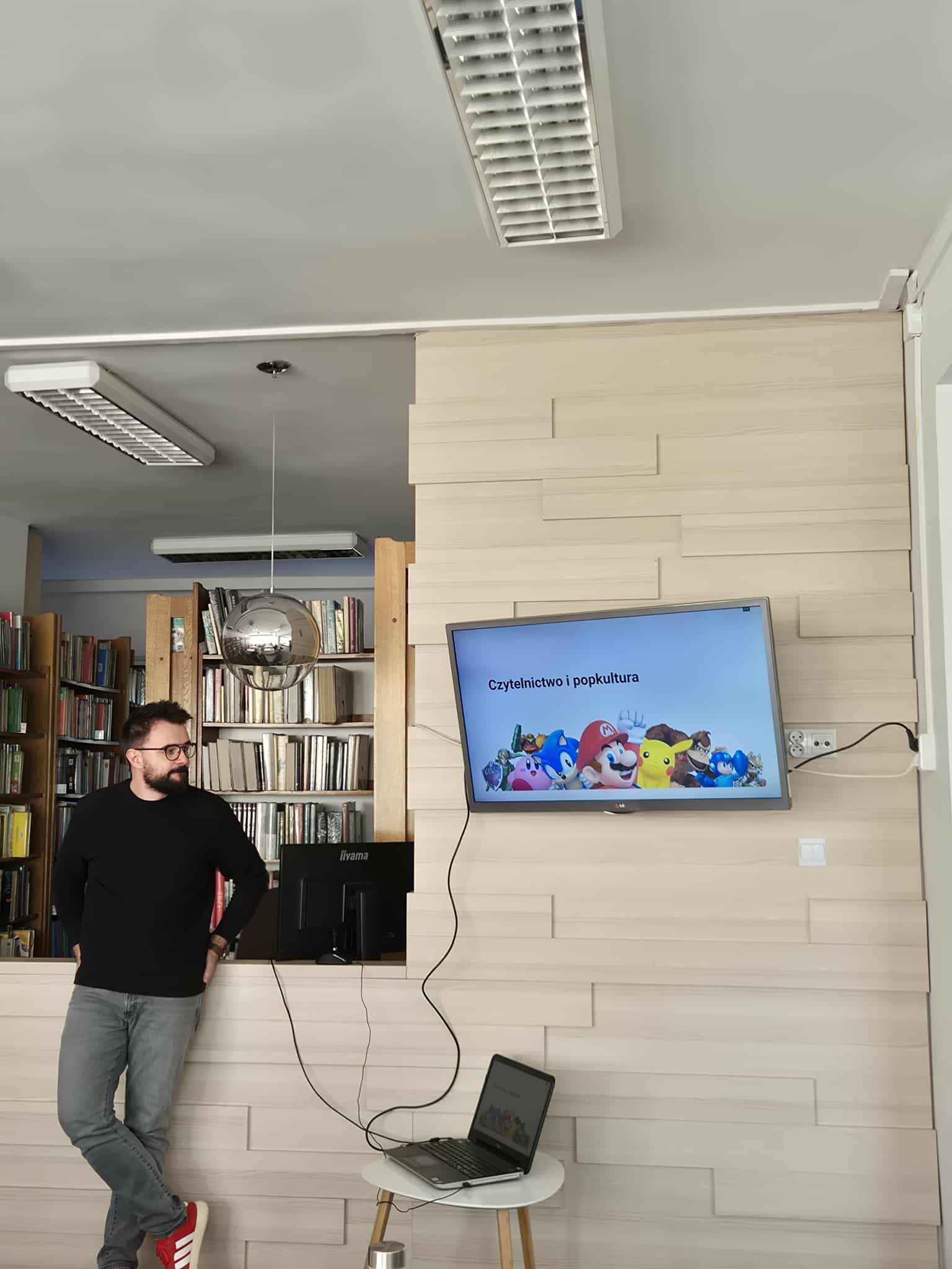 Pierwszy z prelegentów przedstawił temat „Czytelnictwo i popkultura”. Dr Kochaniec pochylił się nad fenomenem gier komputerowych i seriali, które mają ogromny wpływ na współczesną młodzież, ale i nie tylko. Także literatura nie pozostaje obojętna na zjawiska popkulturowe, co potwierdza choćby fenomen niezwykle popularnej gry komputerowej Minecraft, czy bohaterów bajek z uniwersum Walta Disneya, obecnych również na kartach książek dla dzieci i młodzieży. I choć można dyskutować o walorach literackich czy edukacyjnych tego typu wytworów popkulturowych, to bezsprzecznie przyciągają one dzieci i młodzież do bibliotek i księgarń, zachęcając do kontaktu z książką.