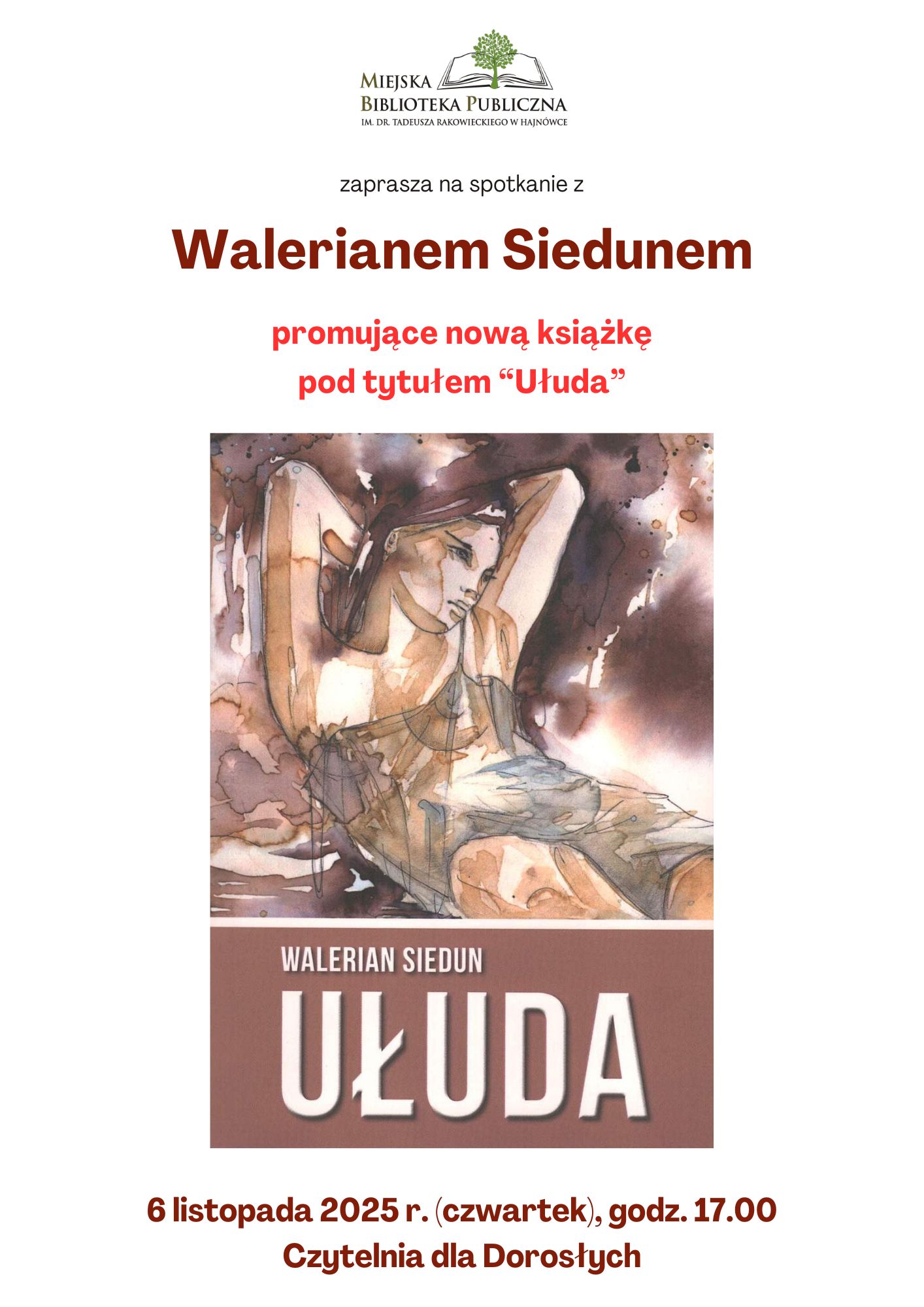 Zaproszenie na promocję książki Waleriana Sieduna pt. "Ułuda"