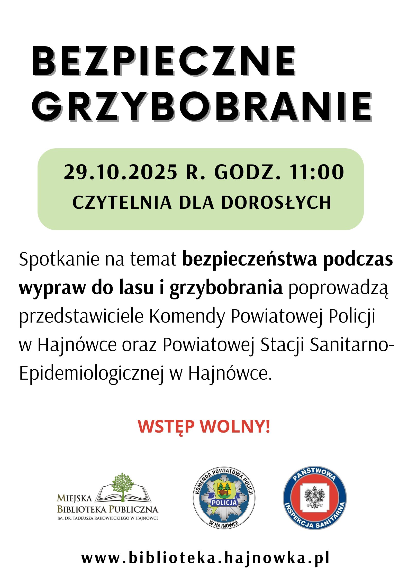 Zapraszamy na spotkanie informacyjne dotyczące bezpiecznego grzybobrania i wypraw do lasu, które poprowadzą pracownicy Komendy Powiatowej Policji w Hajnówce oraz Powiatowej Stacji Sanitarno-Epidemiologicznej w Hajnówce.