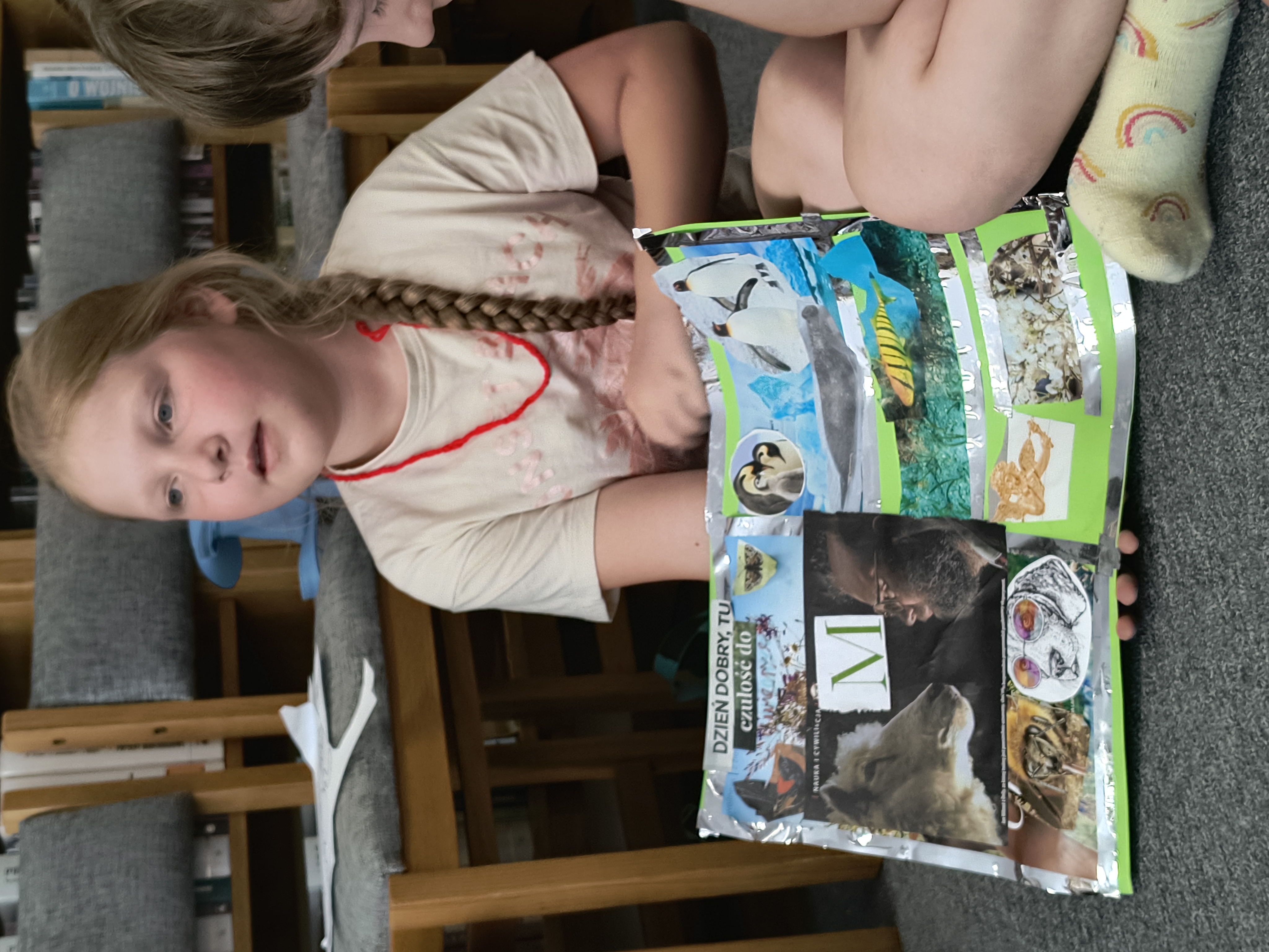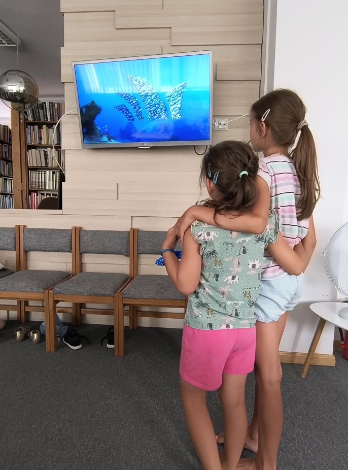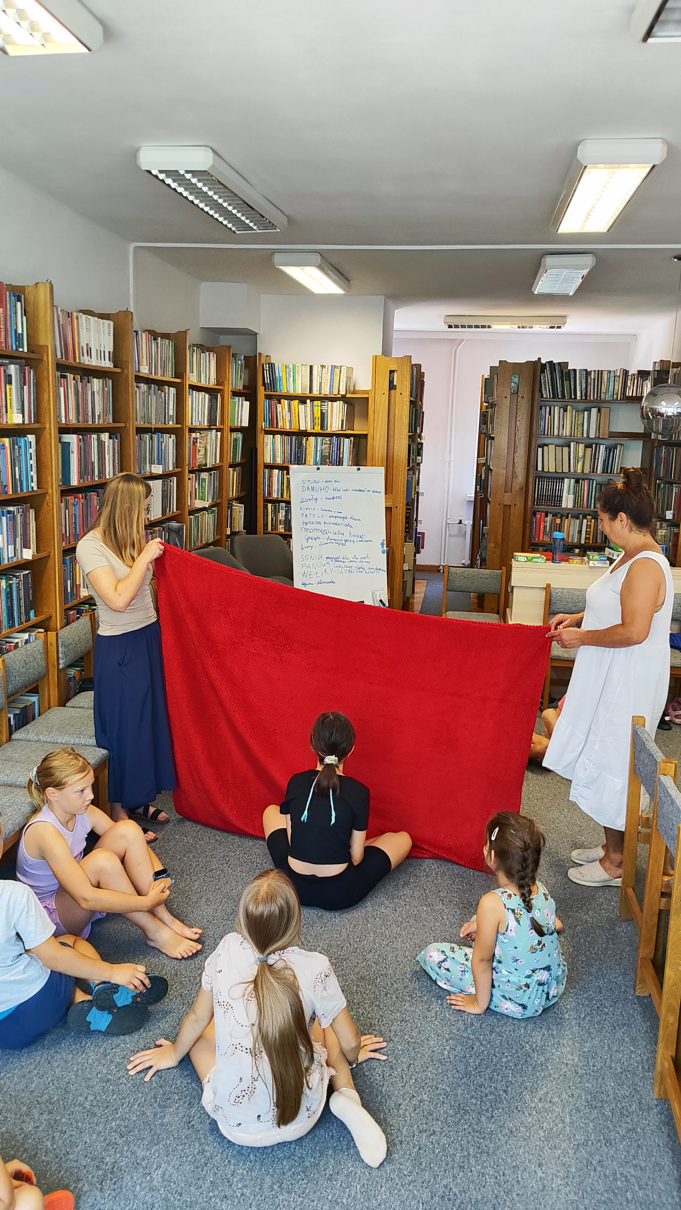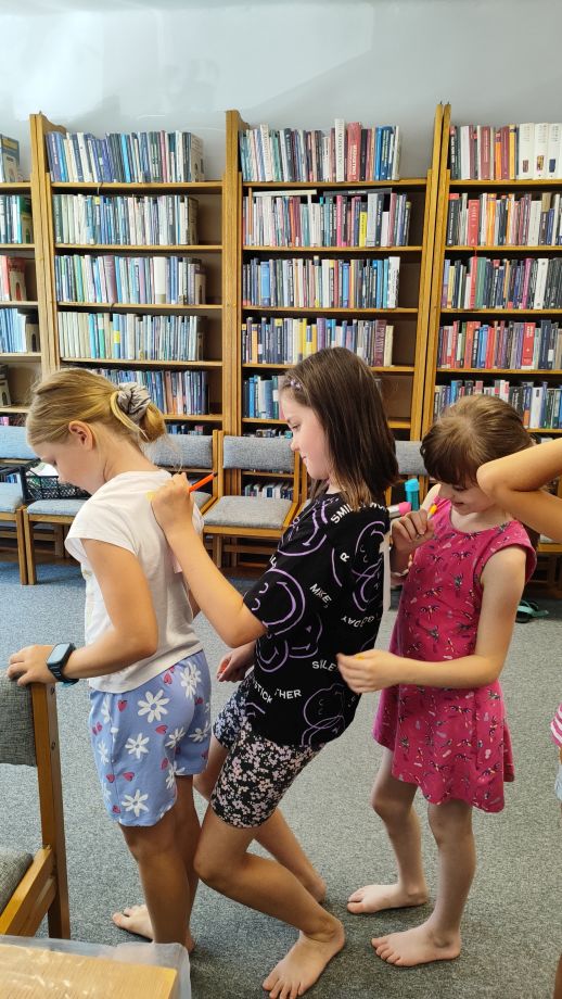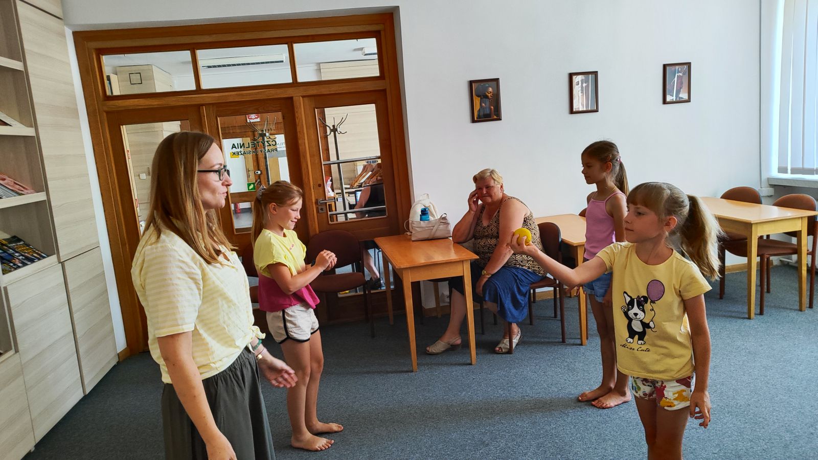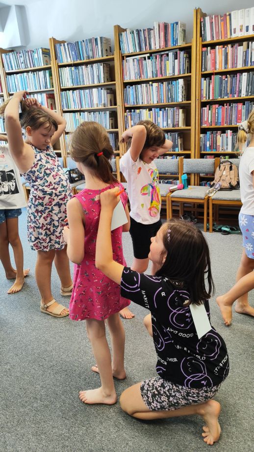 Zainteresowanie wśród czytelników było ogromne. Chcąc zadbać o komfort dzieci w ten upalny czas przenieśliśmy spotkania do Czytelni dla Dorosłych, gdzie jest dogodniejsza przestrzeń do zabaw ruchowych, jak i do wykonywania prac plastycznych.
