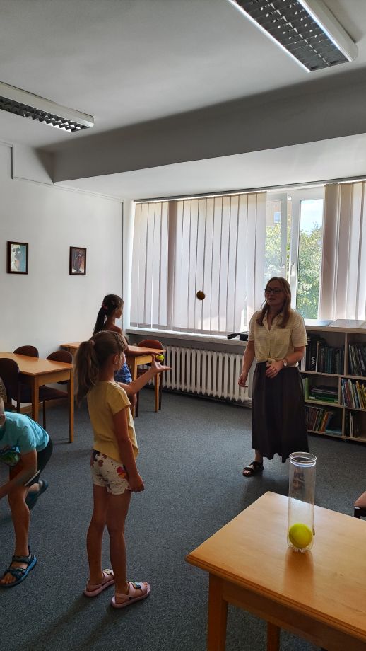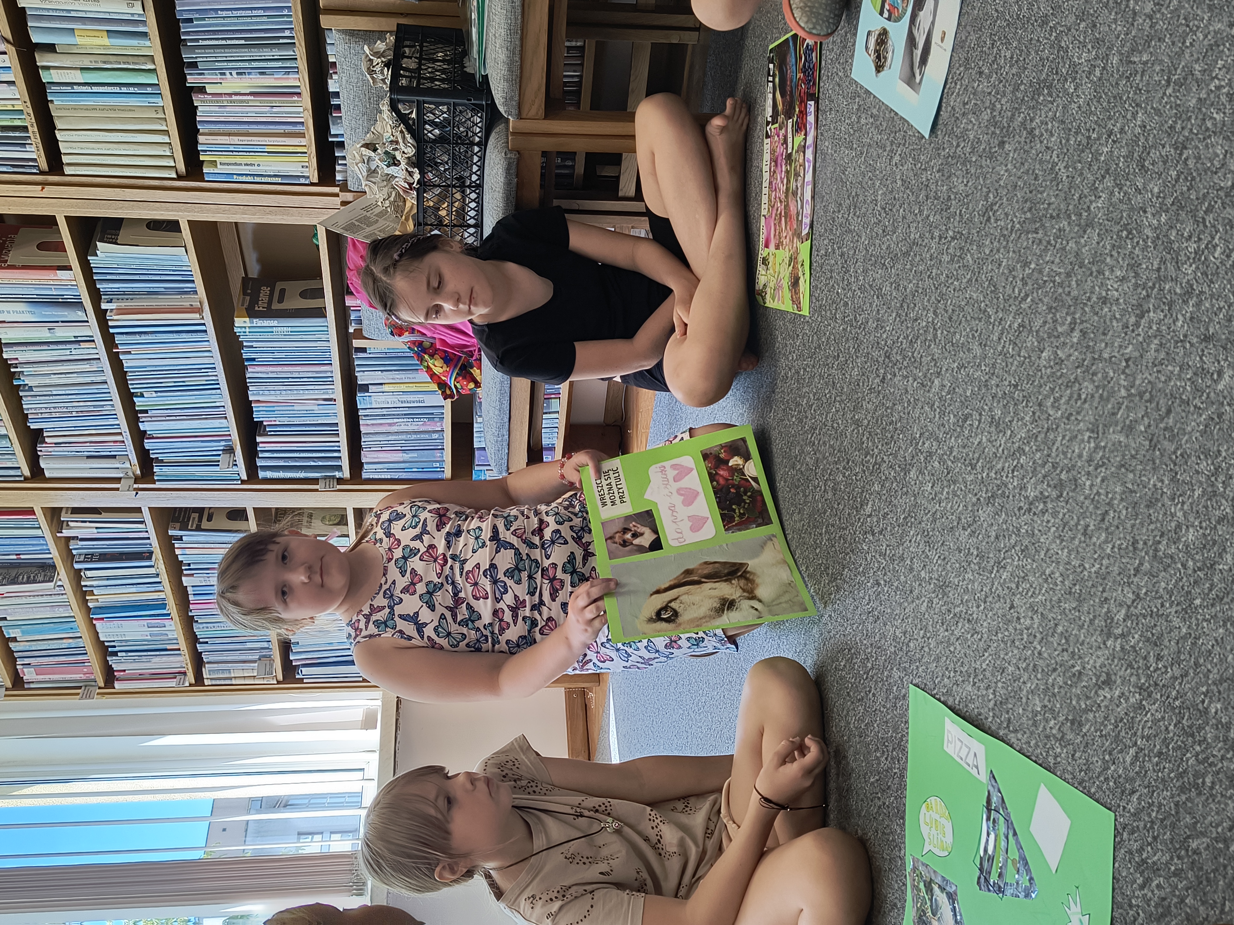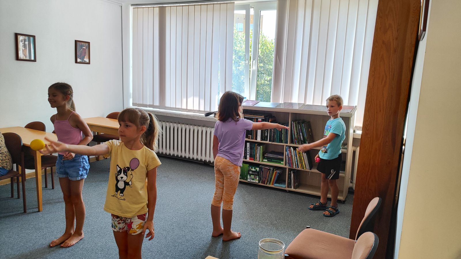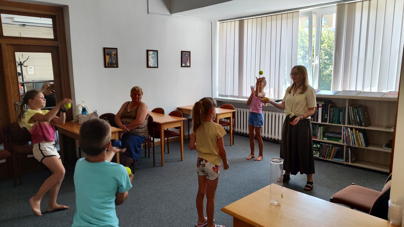 Zainteresowanie wśród czytelników było ogromne. Chcąc zadbać o komfort dzieci w ten upalny czas przenieśliśmy spotkania do Czytelni dla Dorosłych, gdzie jest dogodniejsza przestrzeń do zabaw ruchowych, jak i do wykonywania prac plastycznych.