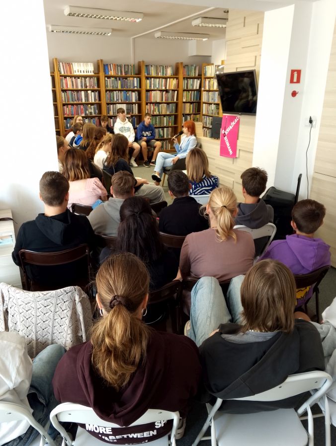 Autorkę przywitała pani dyrektor Agnieszka Kazberuk, a także zgromadzoną publiczność, dziękując za liczne przybycie. W trakcie spotkania Aleksandra opowiedziała o swoich początkach pisarskich, najpierw w postaci rozprawek szkolnych, później twórczości na Wattpadzie. Zdradziła, że pierwsze jej opowiadania powstawały w czasach liceum, a inspiracją do pisania stała się dla niej nie tylko literatura Stephena Kinga i Agathy Christie, ale także muzyka oraz gry komputerowe. Podkreśliła, że pisała najpierw dla siebie, jednak z czasem popularność wśród czytelników Wattpada rosła. Ostatecznie wszystkie jej książki wydało wydawnictwo WasPos. Głównym motywem książek Aleksandry Walendziuk jest gra o przetrwanie głównych bohaterów, którzy posiadają nadprzyrodzone moce. Każda z książek osadzona jest w innym miejscu - w szkole, na obozie i galerii handlowej, a jej bohaterowie muszą zmierzyć się z serią śmiertelnie niebezpiecznych zadań. Autorka przyznała, że wybór tych miejsc nie był przypadkowy - inspirowała się otoczeniem z jej życia.