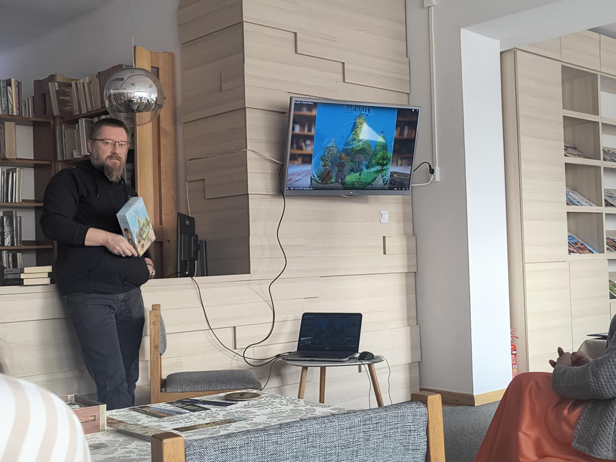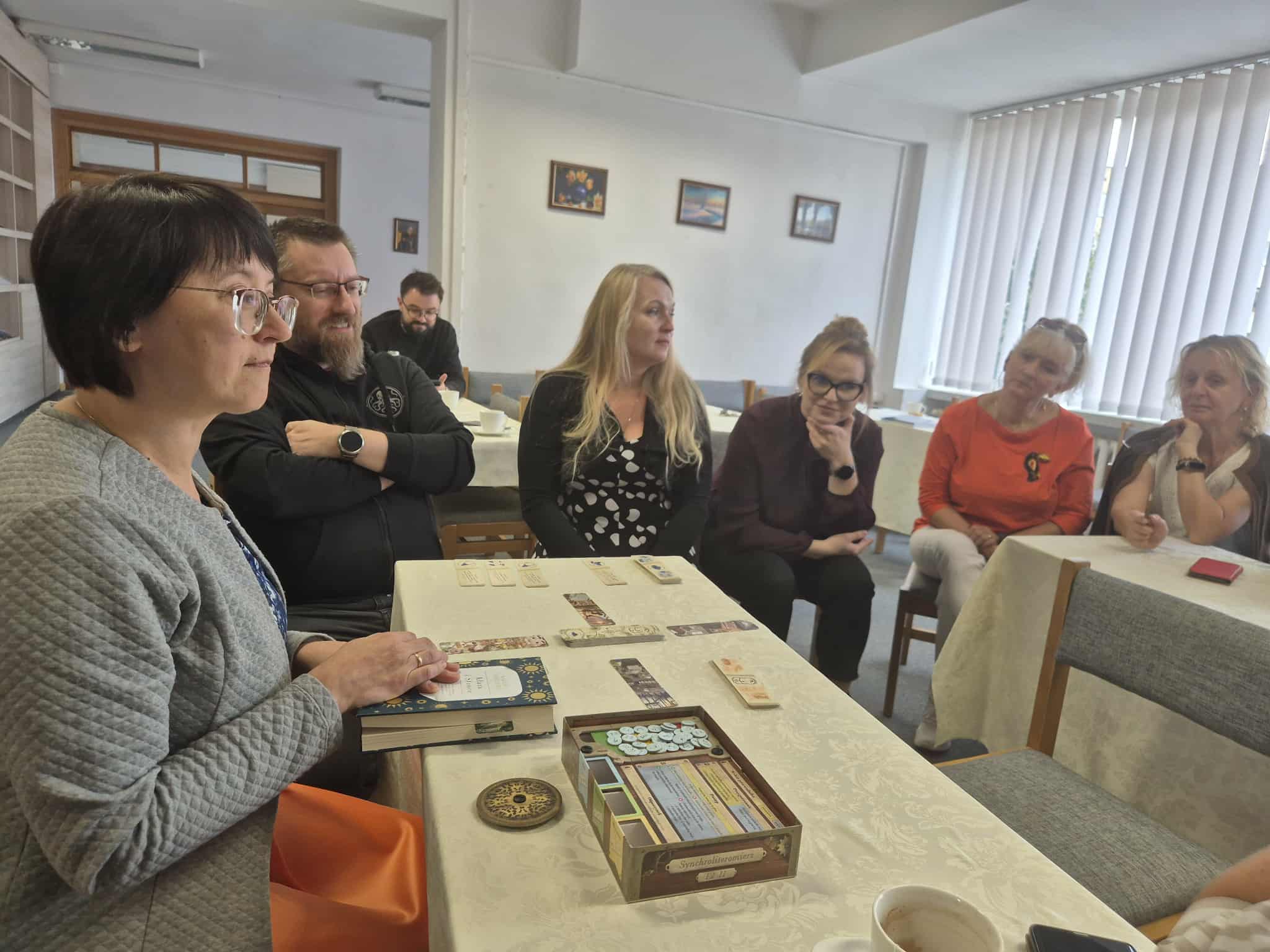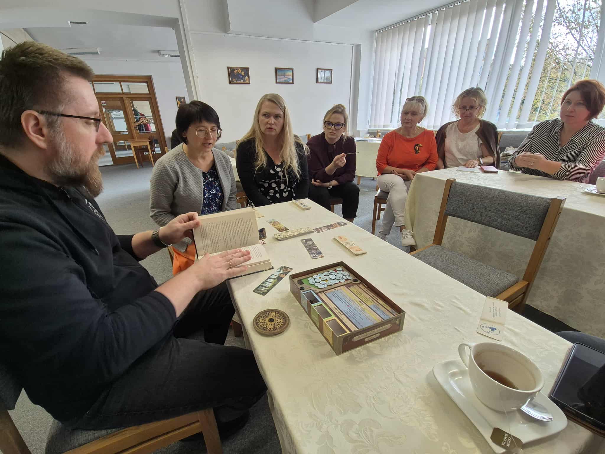 Drugą część szkolenia poświęcono grze planszowej Nowe strony, która w przemyślany sposób łączy elementy rywalizacji i uważnego kontaktu z dowolną książką. Pan Grzegorz Zys zaproponował bibliotekarkom wspólną grę, która okazała się być nie lada gratką dla wszystkich miłośników niezwykłych światów, także tych literackich.
