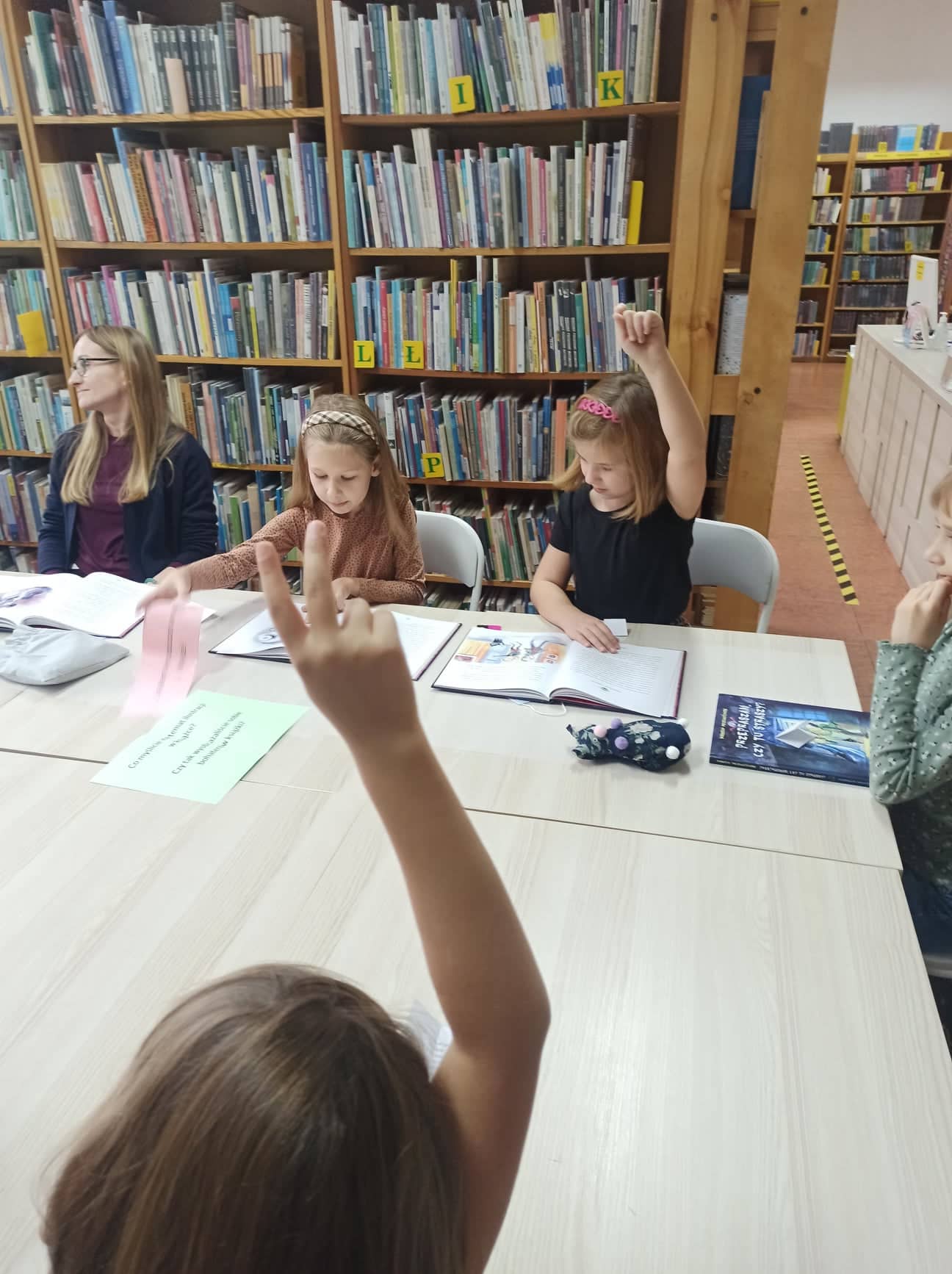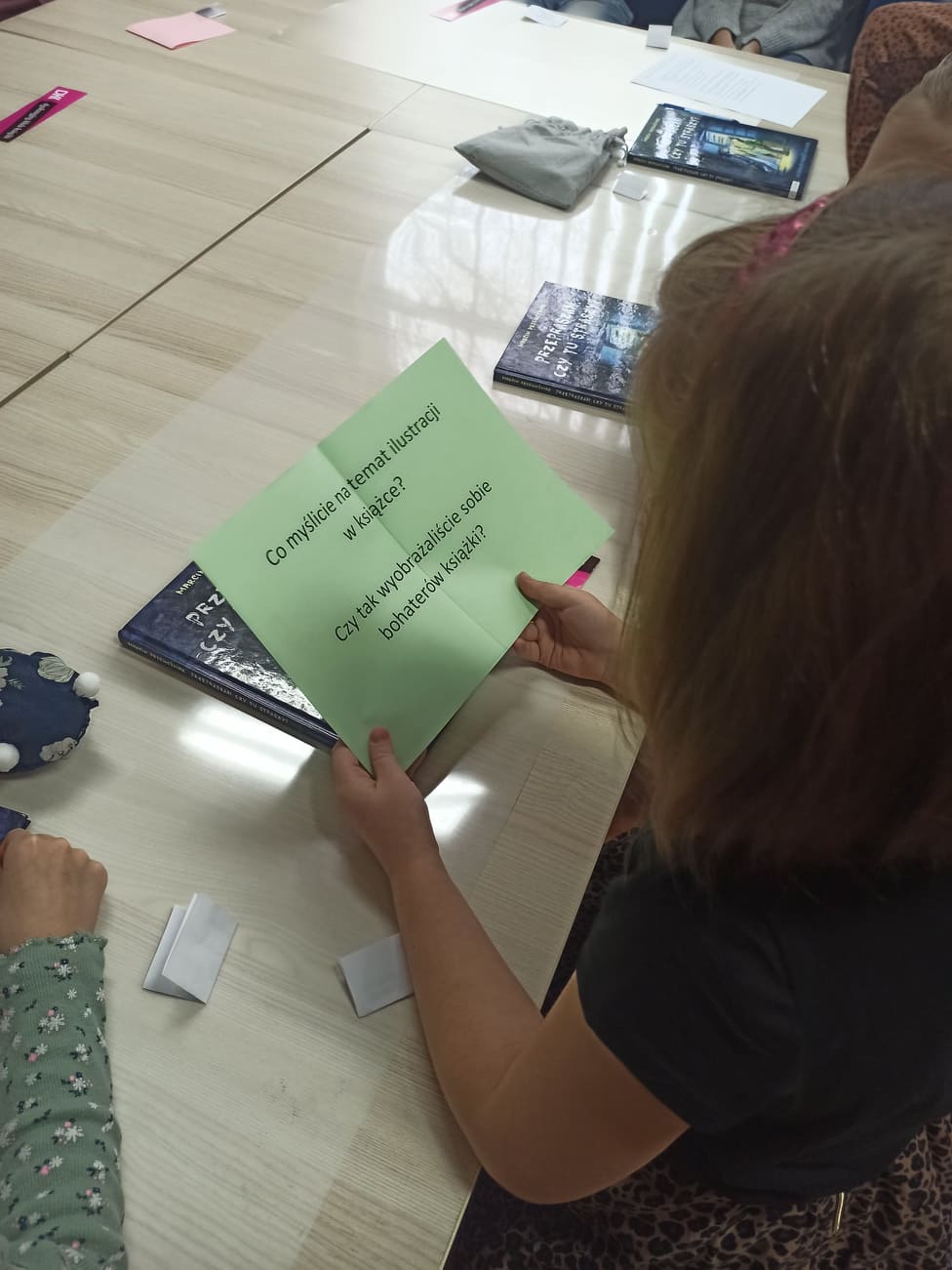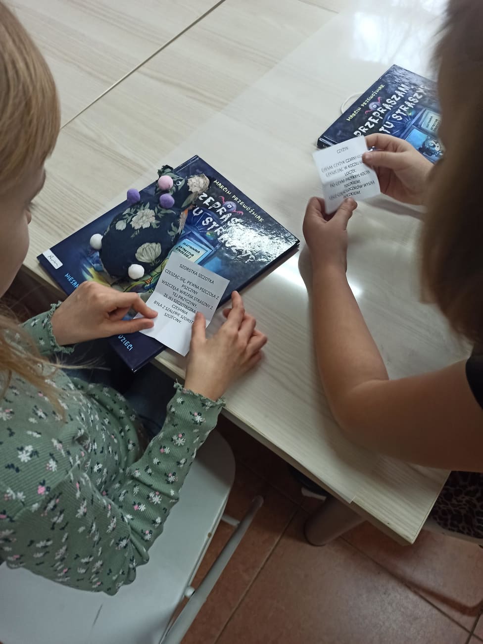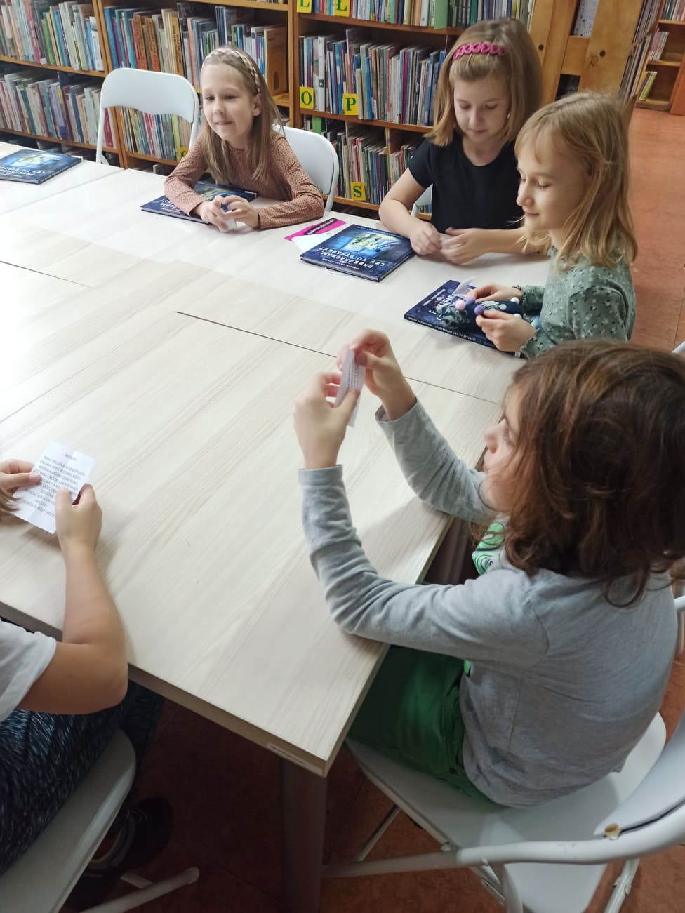 W dalszej części dzieci odnajdywały ukryte między książkami kolorowe kartki, na których zapisane były pytania dotyczące książki. Odpowiadając na nie, wywiązała nam się ciekawa rozmowa. Dzieci chętnie dzieliły się swoimi przemyśleniami o bohaterach opowieści, wymieniały te postaci, które polubiły najbardziej. Mówiły o ilustracjach zamieszczonych w książce oraz na temat fragmentów, które z jednej strony były zabawne, a z drugiej - nieco straszne. Część osób z grupy chętnie poleciłaby książkę Marcina Przewoźniaka koledze lub koleżance z klasy.