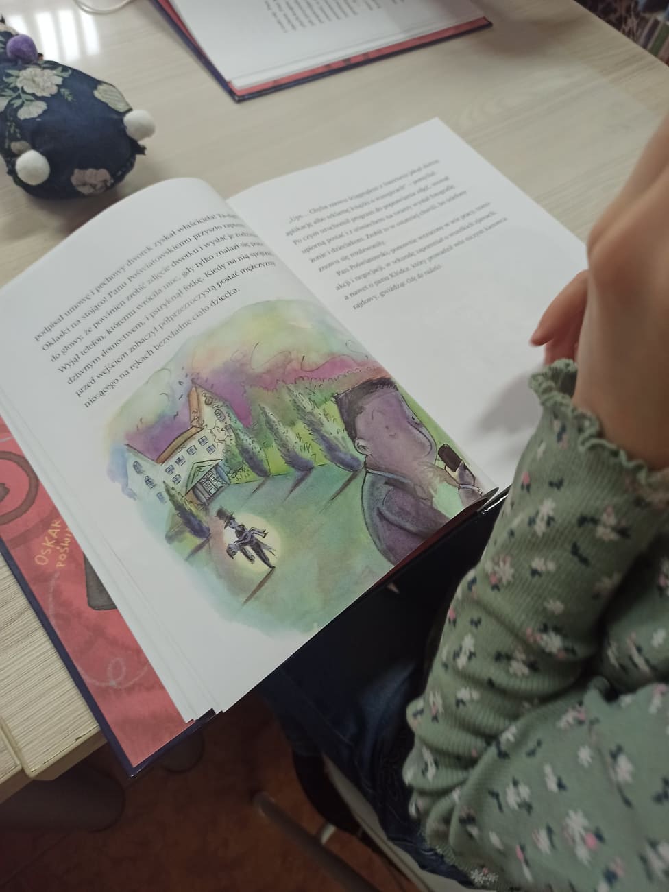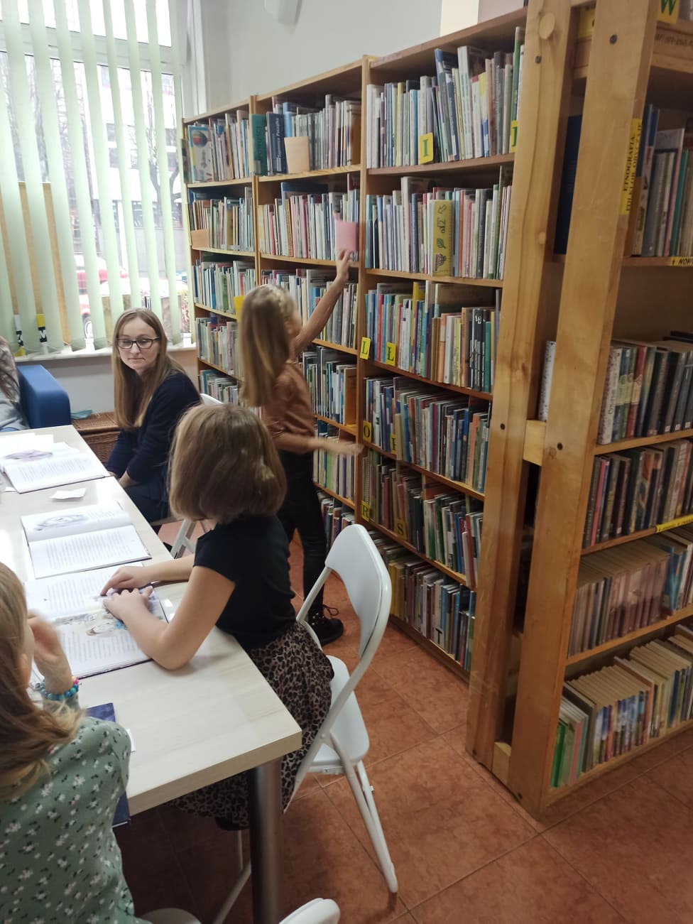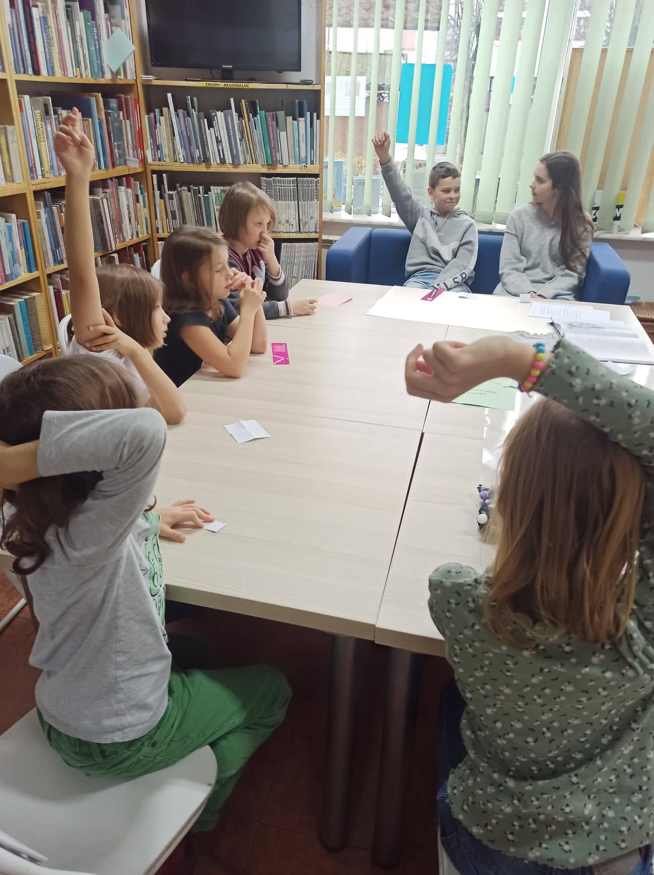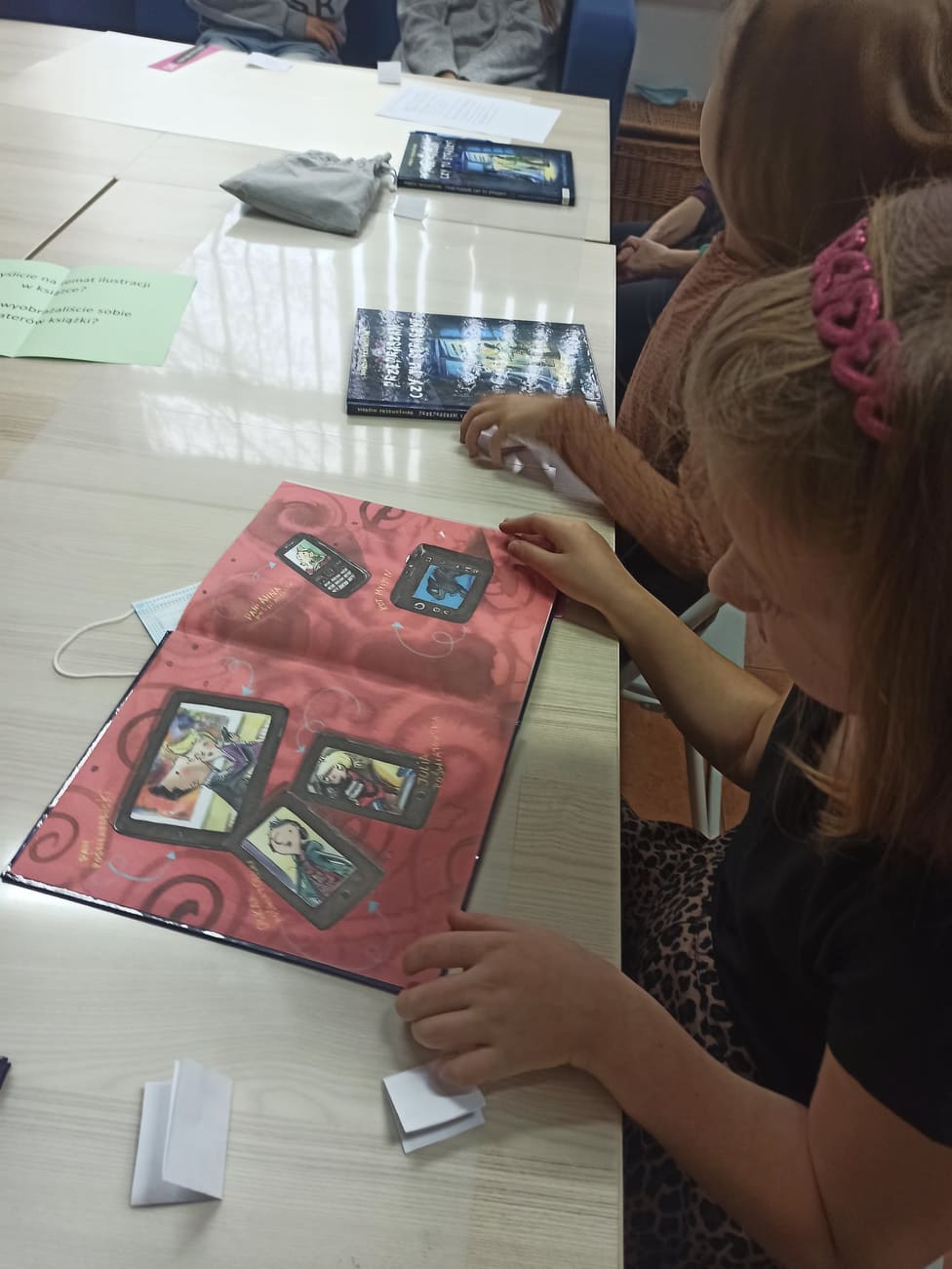 W dalszej części dzieci odnajdywały ukryte między książkami kolorowe kartki, na których zapisane były pytania dotyczące książki. Odpowiadając na nie, wywiązała nam się ciekawa rozmowa. Dzieci chętnie dzieliły się swoimi przemyśleniami o bohaterach opowieści, wymieniały te postaci, które polubiły najbardziej. Mówiły o ilustracjach zamieszczonych w książce oraz na temat fragmentów, które z jednej strony były zabawne, a z drugiej - nieco straszne. Część osób z grupy chętnie poleciłaby książkę Marcina Przewoźniaka koledze lub koleżance z klasy.